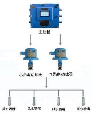 當(dāng)傳感器探測到控制信號時(shí),信號送入主控箱,主控箱先后控制高壓風(fēng)閥、高壓水閥開啟,將高壓風(fēng)、高壓水輸送到風(fēng)水噴頭(即氣水噴頭)進(jìn)行噴霧降塵(風(fēng)水噴頭可對風(fēng)水壓力大小進(jìn)行調(diào)整),噴霧工作至延時(shí)時(shí)間(延時(shí)可調(diào))停止噴霧降塵;當(dāng)信號再次觸發(fā)時(shí),進(jìn)行下一個(gè)工作循環(huán)過程。