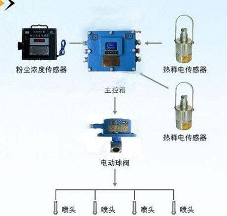 該裝置由微電腦程序化自動控制,粉塵濃度低于粉塵濃度傳感器設定值時,裝置不工作;當粉塵濃度超過粉塵傳感器設定值時,粉塵濃度傳感器將信號送入主控箱,主控箱即控制電動球閥開啟噴霧灑水降塵。當熱釋光控傳感器探測到過往行人時,將信號傳遞到主控箱,主控箱即控制電動球閥關閉,停止噴霧灑水;