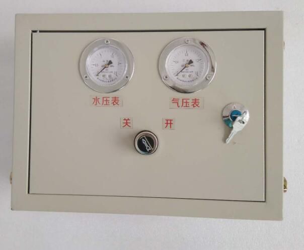 ZPFS氣控式風(fēng)水聯(lián)動噴霧降塵裝置控制箱(以下簡稱控制箱)采用內(nèi)置風(fēng)、水控制閥對裝置用風(fēng)、水壓力進(jìn)行調(diào)控,對風(fēng)水比例進(jìn)行均衡,采用氣控閥(控制箱圖片上的“開關(guān)”)控制噴霧裝置的開啟與關(guān)閉??刂葡溟T扇上鑲嵌氣控閥(開關(guān)旋鈕)控制噴霧裝置的開啟與關(guān)閉,鑲嵌有水壓表、氣壓表,分別顯示調(diào)控后的水、氣壓力。
